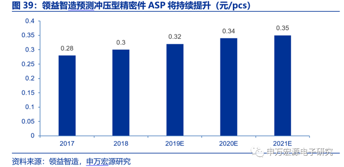 5G催生EMI精密件新机遇,单机料号与ASP均有望提升。5G时代智能手机由于信号频率、信号强度、传输速率等的提升,内部结构及零部件都将迎来革新。5G的传输速率理论可达到4G的100倍,传输速率以及射频器件数量的大幅增加将显著提升电磁屏蔽需求,单机EMI结构件料号有望大幅增加。同时设计与工艺难度将比原有产品提升,新规格料号ASP将有较大提升。根据精密件龙头领益智造的预测,其未来包括EMI器件在内的冲压型精密件ASP将持续提升,这也反应了整体行业的趋势。