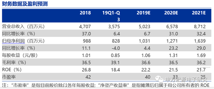 4)连接器业务:公司2019年对连接器业务进行了结构调整,主动减少了一些低毛利的业务,同时陆续导入一些大客户的消费电子项目,将于明年起逐渐贡献收入。预计19/20/21年收入增速为-35%,25%,20%。