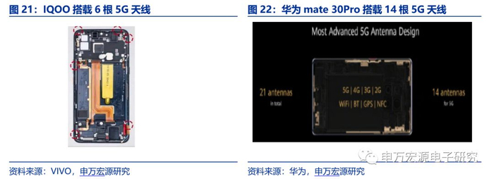 从近期手机厂商发布的5G新机来看,亦印证了单机天线大幅增加的确定性。VIVO发布的5G手机 IQOO Pro采用了5G 6天线设计,6根5G天线分布在手机两侧边框处。该机型合计天线数量达12根。而华为发布的mate 30pro 5G版更是搭载了14根5G天线,合计共21根天线,并采用了金属中框和LDS相结合的方案。从已经陆续发布的5G机型来看,高端5G旗舰机的单机天线增量远大于4根,5G带来的天线增量空间十分可观。