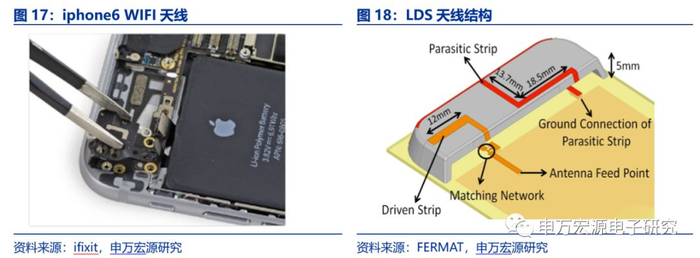 LDS为当前高端机主流天线方案。LDS(Laser-Direct-structuring),是利用计算机按照导电图形的轨迹控制激光的运动,将激光投照到模塑成型的三维塑料器件上,活化出电路图案。在成型的塑料支架上,利用激光镭射技术直接在支架上化镀形成金属天线,可以直接将天线镭射在手机外壳上。其优势在于一致性好,精度高。能够充分利用支架立体结构来形成天线,不需要对模具进行重新的修正,对于手机内部结构设计的灵活度大幅提升,增强了手机空间的利用率,顺应轻薄化的趋势。因为是将天线镭射在手机外壳上,避免了手机内部元器件的干扰,保证了手机的信号。Iphone6、iphone7的WiFi天线均采用LDS方案。