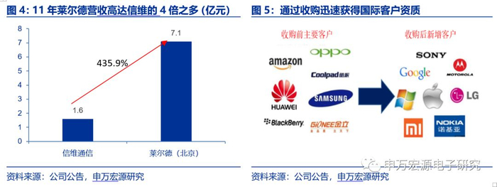 蛇吞象式收购带来营收规模的大幅扩张,迅速取得国际客户认证资质具有重大战略意义。在收购时的2011年,莱尔德的营收达7.1亿元,2011年信维的营收规模仅1.7亿元,其规模高达信维的4倍之多。除规模的扩张外,此次收购更大的意义在于客户结构的变化。信维当时的客户以国内厂商为主,包括金立、华为、OPPO等,而莱尔德的客户结构主要为国际一线整机厂,包括诺基亚、摩托罗拉、索尼、苹果等。国际客户对于供应商有严苛的资质认证体系,若公司自身申请相应资质,获得供应商资格通常需要2年以上。通过收购,公司自动承接莱尔德国际客户的供应商资格,使公司的销售渠道、客户群迅速上升到更高的平台。