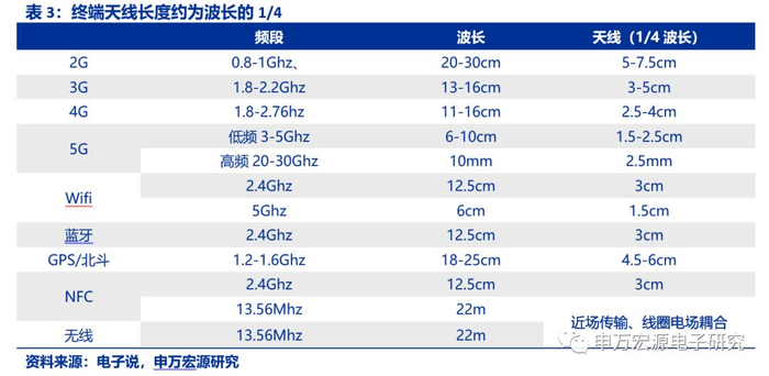 终端天线主要负责接收和发生电磁波,是实现电磁波信号和电信号能力转换的重要器件。其本质是由线径远比波长小,长度可与波长相比的一根或多根金属导线构成。根据功能的不同,可分为主通信天线、Wi-Fi天线、蓝牙天线、GPS天线,以及NFC天线等。部分应用频段有交叉,其天线可在一定程度上共用。通常情况下天线长度为波长的1/2-1/4,因此传播频率越高,天线的长度越短。