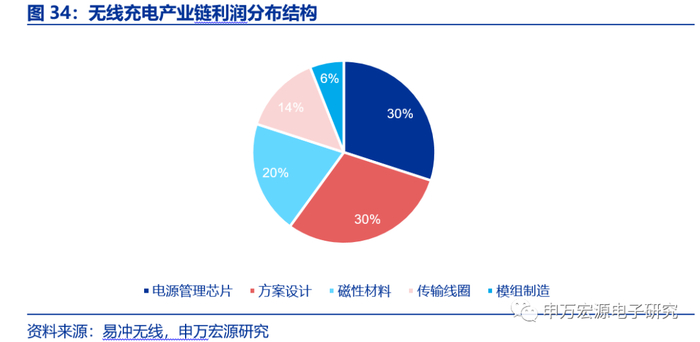 无线充电产业链主要分为5大环节,方案设计、电源管理芯片、磁性材料占据主要利润,单纯模组制造价值低。无线充电产业各环节中,方案设计利润占比30%,电源管理芯片利润占比30%,磁性材料20%,传输线圈14%,模组制造6%。整个全模组端占据了40%利润,单一模组制造利润非常有限,门槛较低。