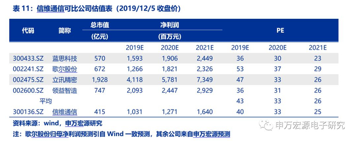 首次覆盖,给予“增持“评级。基于以上假设,预测公司19/20/21年营业收入分别为50.2/65.8/87.1亿元,预测19/20/21年归母净利润分别为10.3/12.7/16.4亿元。选取消费电子零组件龙头歌尔股份、立讯精密、、领益智造、蓝思科技作为可比公司。可比公司2020年平均PE为33倍。信维通信为国内泛射频解决方案龙头,同上述可比公司在各自领域的产业地位类似,并且都属于苹果核心供应商,可比性较强。随着明年5G手机的大规模放量,天线的量价齐升效应将给公司业务带来显著增量,不同天线方案之间的单机价值量变动弹性较大,考虑到5G给公司带来的业务弹性高于可比公司,同时兑现度也较为确定,可给予一定估值溢价。给予“增持“评级。