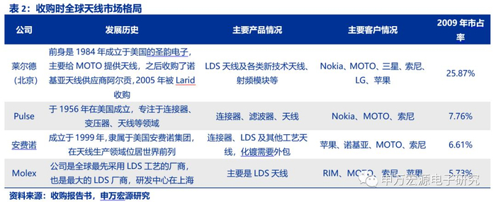 公司于2011年底以1.98亿现金收购莱尔德(北京),一举奠定国内射频天线龙头地位。莱尔德(北京)为莱尔德(英国)旗下从事手机天线的研发、生产和销售的全资子公司,为当时全球天线龙头,2009年市占率高达25.9%。在公司2010年上市阶段,全球移动终端天线供应商仍以欧美为主,全球前五市占率近60%。此次收购是公司发展历程的关键一步。