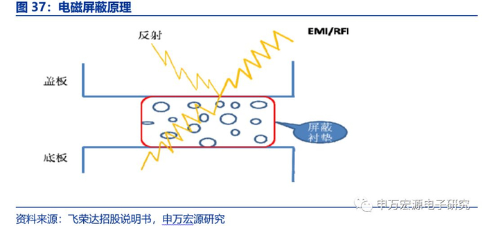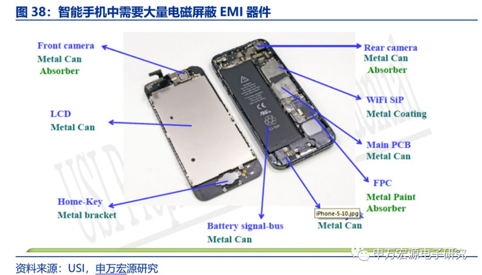 智能手机为EMI/EMC器件重要应用领域。手机由于内部结构紧密,且集成了大量具有电磁辐射干扰的功能器件,因此对于EMI器件需求量巨大。具体来看,前后摄像头、WIFI、GPS、蜂窝网络等各类通信模块、PCB、FPC、显示屏、触控模组等各类功能性组件均需要相应的EMI器件进行电磁屏蔽。