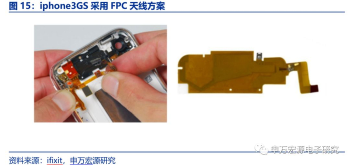 FPC天线是通过在软板上用铜薄膜做成导线作为天线。Iphone、iphone3G、iphone3GS均采用FPC天线设计,蜂窝天线内置于手机底部,WIFI、蓝牙天线位于手机上部,通过同轴连接线与主板互联。其特点是设计上简单、生产成本较低,缺点是容易受到五金件及装配密度影响。随着天线工艺的不断发展,目前FPC天线主要用在4G中低端手机以及智能硬件中。