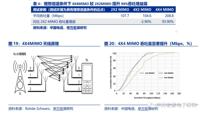 MIMO为5G核心技术,将显著提升单机天线需求量。MIMO是通过使用多个发射、多个接收天线,在单个无线信道上同时发送和接收多个数据流的技术。其能够在不增加频谱资源和天线发射功率的情况下,成倍的提高系统信道容量。MIMO的阶数表示可独立发送或接受信息流的数量,亦等同于基站发射端与终端接收天线的数量。根据中国电信的数据显示,4X4 MIMO较2X2 MIMO可提升约94%的吞吐量增益。且在信道情况较差的情况下,4X4MIMO提供的吞吐量增益更显著。