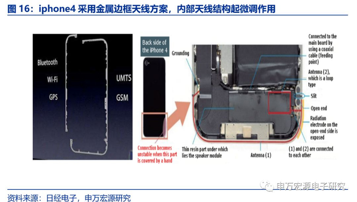 金属边框天线即将主天线外置于金属边框。2010年iphone4首次采用边框作为天线。金属边框采用了CNC不锈钢工艺,左侧和顶部的两条缝隙将其分为两段。该边框不仅起到了机身框架的作用,同时还是手机的无线天线。两段中的左半部分起到了WiFi、蓝牙和GPS天线的作用,右半段则是UMTS/GSM手机网络天线。Iphone5、iphone5s均采用了金属中框天线方案。同时主天线不仅存在于机壳的侧面,还与手机内部的另一天线结合共同构成。内部天线对机壳侧面天线起辅助作用,用来进行微调以适配不同波段。