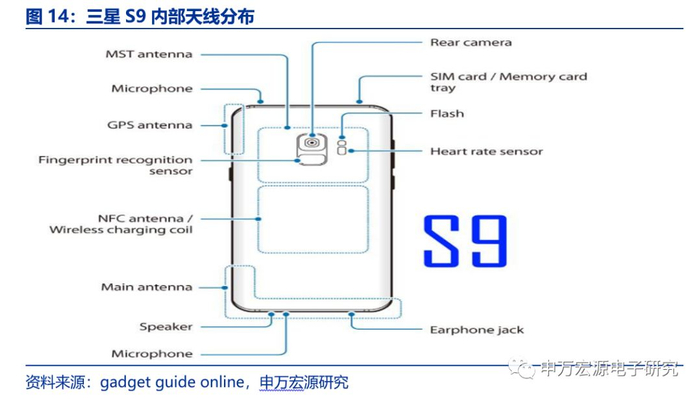 以三星S9为例,其手机内部的移动通信主天线在手机底部与左侧(4X4 MIMO),GPS天线位于手机上左侧,NFC与无线充电线圈位于手机中间。此外,还集成了磁性安全传输线圈MST天线,主要用于磁条卡的支付通信。