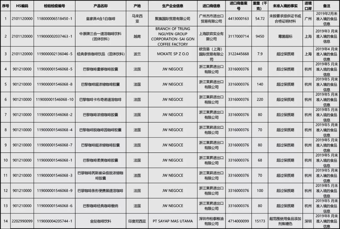 14批次咖啡产品未准入境