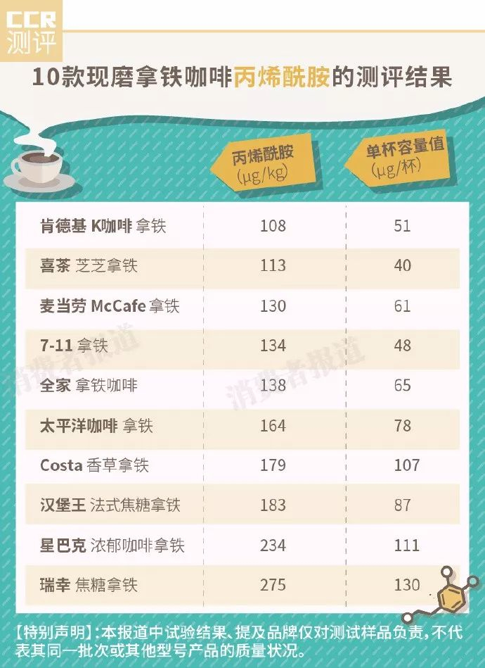 今年5月,《消费者报道》曾向第三方权威检测机构送检了10款线下门店热销的现磨拿铁咖啡,检测总糖、咖啡因、丙烯酰胺等指标。