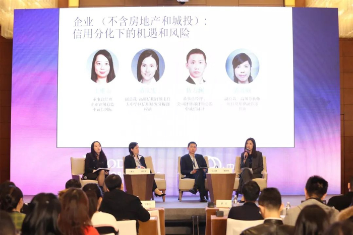 分论坛(企业融资):中诚信国际董事总经理、企业评级总监王雅方(左一)、穆迪大中华区信用研究分析副总裁 - 高级信用评级主任董庆雯(左二)、中诚信证评董事总经理、公司评级部评级总监伍力澜(右二)、穆迪项目及基建融资部副总裁/高级分析师潘凯颐(右一)