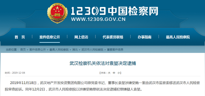 12月4日,12309中国检察网披露,11月18日,武汉地产开发投资集团有限公司(以下简称“武汉地产集团”)原党委书记、董事长袁堃涉嫌受贿一案由武汉市监察委移送武汉市人民检察院审查起诉。12月2日,武汉市人民检察院以涉嫌受贿罪依法决定逮捕犯罪嫌疑人袁堃。