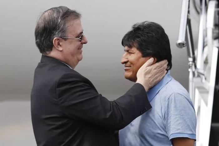 △墨西哥外长埃布拉德在机场迎接来接受政治庇护的莫拉莱斯