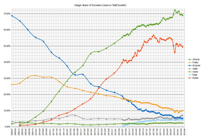 今天,Chrome 浏览器占据了浏览器市场约65%的市场份额,微软的新 Edge+老 IE 合起来只占大约4%,而且 IE 已经不再被很多主流网站支持。