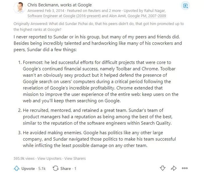[1]https://www.quora.com/What-did-Sundar-Pichai-do-that-his-peers-didnt-to-get-promoted-through-the-ranks-from-an-entry-level-PM-to-CEO-of-Google?awc=15748_1575509984_cda992115adcd004438bc08f95998b54&campaign=uad_mkt_en_acq_us_awin&medium=ad&pub_id=78888&set=awin&source=awin&txtv=8&uiv=6#