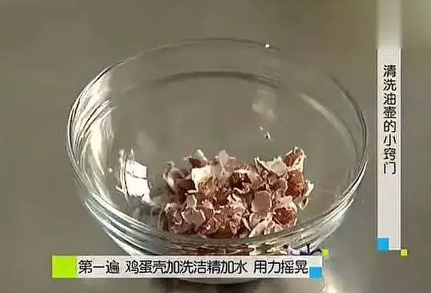 将淘米水倒掉后,油壶里装入鸡蛋壳和白醋再使劲摇晃几次,如此经过两次去油过程,油壶里面的油垢便彻底松动,再用清水冲洗干净即可。