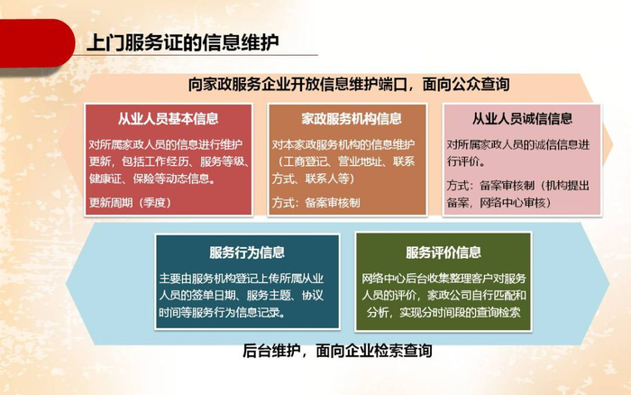 (2)拓展上海家政服务信息追溯系统功能。查询检索:家政从业人员查询、家政服务机构基本信息查询。追溯跟踪:从业人员的追溯,服务工作经历情况的有效追溯。服务测评:从业人员的服务评价,规范性测评,向家政企业反馈信息。诚信评价:从业人员及家政服务机构的诚信情况。行业统计:服务派单数据的汇总统计,做好行业统计。数据分析:家政服务大数据的集约,后台数据分析,趋势研判。资源调配:家政行业的峰谷预警与预案调配,供需对接的资源合理配置。行业监管:向主管部门提供行业动态数据,作为行业管理和提升依据之一。
