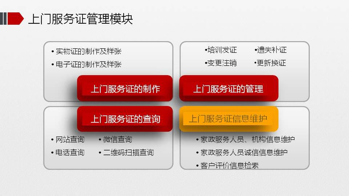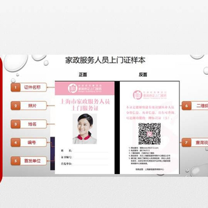 (4)上门服务证管理。统一制作上门服务证(含电子上门服务证)和信息监管,制定《上海市家政服务人员上门服务证管理办法(试行)》,规范家政上门服务证的登记、培训、制作、申领、发放、注销等管理,由从业人员所在家政服务机构署名(见图4)。