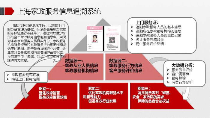 上海探索的家政持证上门服务,以“上门服务证”为载体,以信息系统为支撑,构建了以市场化为主体的监管模式,有效促进了家政员诚信安全服务,夯实了发证企业主体管理责任,提升了政府对家政行业的信息化服务监管。对家政员而言,上门服务证定位于家政从业人员的工作证,持证家政员须事先提供“征信授权书”,授权发证企业和监管部门依法查询其征信情况,持证上门服务成为家政员诚信安全服务的一个标志。对消费者而言,选择持上门服务证的家政员,利益一旦受到侵害,上门服务证的“可查询、可追溯、可评价”功能,使追责成为可能,多了一份安全保障。对家政企业而言,根据“谁发证谁负责”的原则,负有对持证家政员的审核把关管理之责,成为企业规避风险的正常经营行为。
