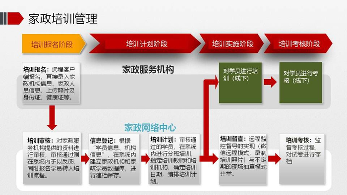 (5)上门服务证培训。培训对象为在沪从事家政服务的从业人员及家政服务机构的管理人员。参加培训的服务机构应具有良好的商业信誉和社会知名度;无严重违规、无重大质量投诉事件;主动承担社会责任,积极参与节假日市场保障供应等。持证上门服务作为行业自律行为遵循自愿参加原则。培训内容集中在上门服务证的功能介绍,申请流程、条件、资格、出具材料,证的使用、管理、注销,持证人员的职业道德、文明礼仪、法律常识、安全知识、电器操作与安全、家庭照料等内容。家政培训管理流程见图5。