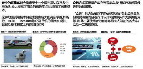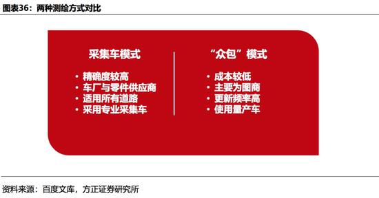 目前市场上高精度地图数据获取主要包括采集车测绘、“众包测绘”两种途径。我们认为,两种数据采集方法各有优势,未来二者有望并存。