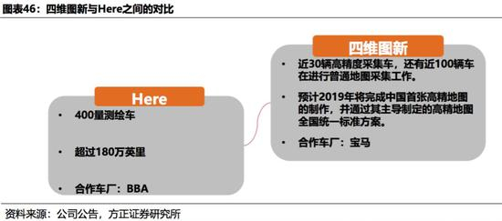 2015年8月,Here被宝马奔驰奥迪三大德系车厂联合收购,开启了车企图商联合开发高精度地图的新模式,随着量产车加入数据采集工作,Here的高精度地图绘制效率将大大提高,并有望实现地图数据的实时更新。近年来,公司以高精度地图为切入点逐步布局无人驾驶领域:从技术层面来看,公司具有深厚的技术沉淀和数据支持;在战略部署方面,四维图新收购杰发科技,完成地图、芯片全面布局,并与国内外诸多车企展开合作。我们认为,图商、车厂合作的模式同时具有精度高、更新快的竞争优势,将仍为未来车载高精度地图市场的主流。