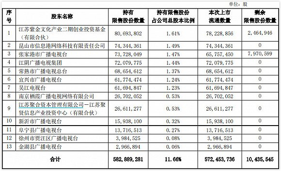 股价走低江苏有线限售股解禁在即 13位股东一年亏48%