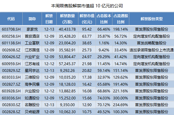 解禁市值超过10亿元的上市公司合计有13家,家家悦、首旅酒店(600258.SH)、工业富联(601138.SH)、江苏国信(002608.SZ)、兴业矿业、江苏有线、星网宇达(002829.SZ)7家公司解禁市值均超过20亿元。