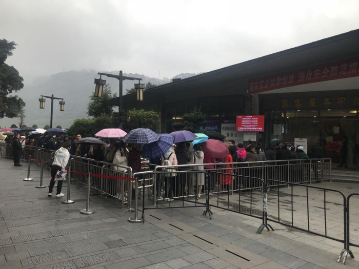 第三天也就是周一中午12点,作者第三次造访中国酒文化城,因为午休时间未到,作者和几个同样有备而来的游客提前占据了队头。当天,茅台镇气温骤降,山间雾气混杂着愁人的细雨,这种多变的湿冷天气据说培育了发酵茅台酒所必须的特种菌群。