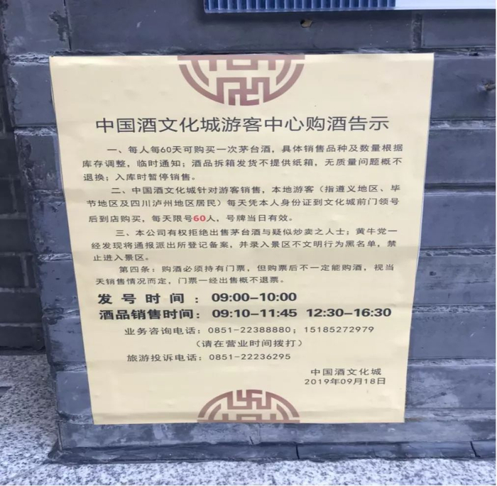 告示显示,每人每60天可购买一次茅台,本地人则取号限购飞天茅台