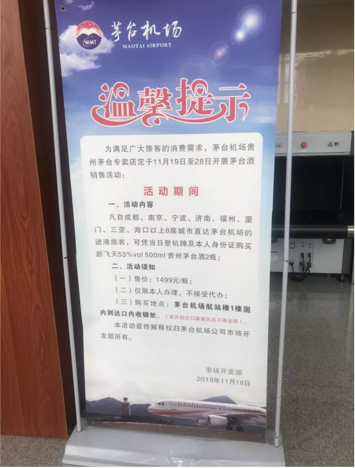 距离茅台镇100公里的遵义新舟机场和前述所说的贵州茅台机场,分别在2012年和2017年通航,也均设有茅台直营店。持有外地身份证的到港旅客,可以凭借登机牌平价购买两瓶1499元飞天。
