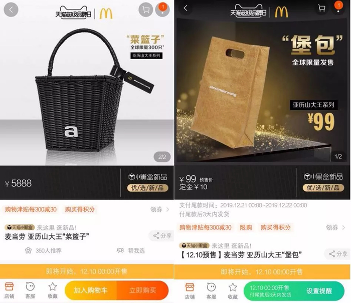 从麦当劳中国天猫旗舰店可查询到,全球限量300只的“黑金篮子”预售价格为5888元,品牌方称设计灵感源于野餐篮。而外号为“堡包”的一款手包预售价为99元,则是由麦当劳的外卖纸袋汲取的灵感。