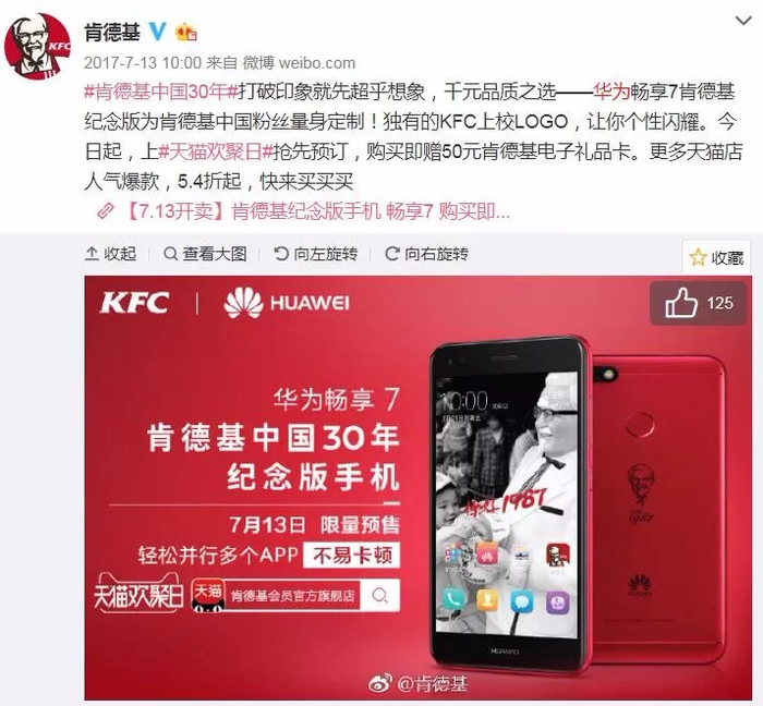 2017年,肯德基为纪念进入中国市场30周年,联手华为推出了名为“华为畅享7肯德基纪念版”的手机,售价1099元。有部分消费者称,同时作为两个品牌的忠实消费者,会考虑购买此款手机。