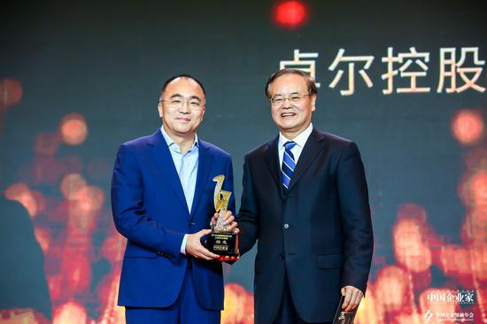 新浪财经讯 “中国最具影响力的25位企业领袖颁奖典礼”今日在北京举行。卓尔控股有限公司董事长阎志(左)获此殊荣,全国工商联原副主席庄聪生为其颁奖。