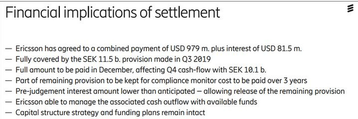 12月7日,据环球时报,爱立信承认,该公司在近17年来在多国存在行贿行为,为此已与美国检方达成和解,向后者交付超过10亿美元的和解金。对比该公司近年财报,这笔罚金相当于爱立信单季营收的五分之一。