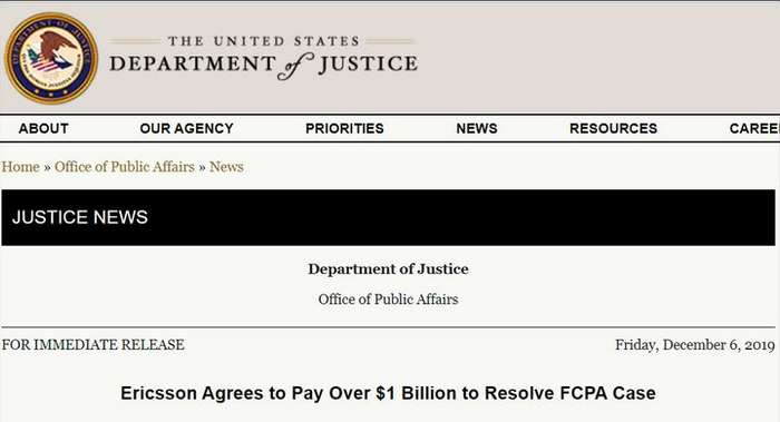 据环球时报,美国司法部12月7日公布文件显示,爱立信旗下的埃及子公司承认在2000年到2006年与其他参与者共谋违反了美国《海外反腐败法》,通过第三方代理商和顾问,以行贿基金、礼物等方式,贿赂越南、吉布提等5个国家的政府官员,贿赂金额超过数千万美元,并涉嫌伪造会计记录。
