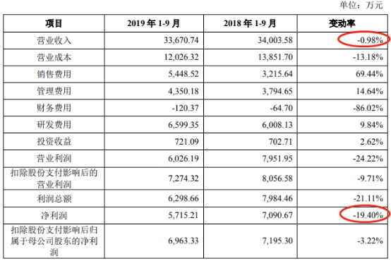 据光云科技招股书(上会稿),2019年1-9月,光云科技营业收入为3.37亿元,同比下滑0.98%;净利润为5715.21万元,同比下滑19.40%。