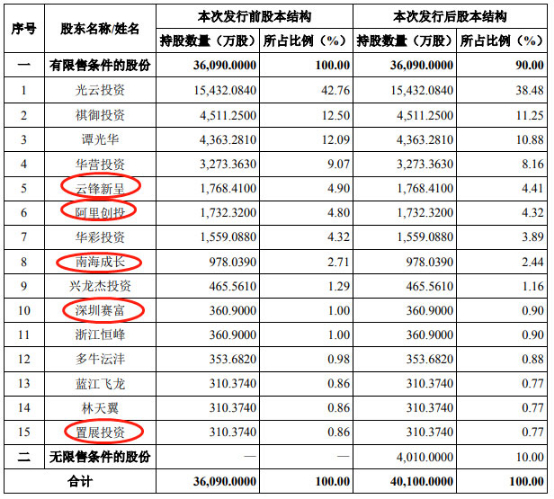 本次发行前,光云科技股东名单中,云锋新呈、阿里创投、南海成长、深圳赛富分别持有光云科技总股本的4.9%、4.8%、2.71%、1%,分别位列第五、六、八、十大股东。