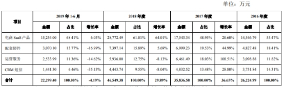 2016年-2018年及2019年1-6月,电商SaaS产品收入占光云科技营业收入的比例分别为55.47%、48.95%、61.81%、68.41%。