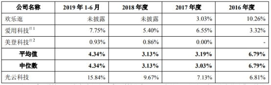 2017年、2018年及2019年1-6月,光云科技销售费用率均为同行最高。2016年-2018年及2019年1-6月,光云科技销售费用分别为1785.96万元、2552.76万元、4501.69万元、3531.57万元,占营业收入比例分别6.81%、7.13%、9.67%、15.84%。同行可比公司欢乐逛、爱用科技、美登科技销售费用率平均值分别为6.79%、3.19%、3.13%、4.34%。