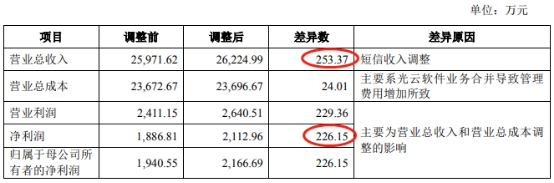 其中2016年,光云科技调整后的营业总收入为26224.99万元,较调整前的25971.62万元多253.37万元。差异原因为短信收入调整。调整后的净利润为2112.96万元,较调整前的1886.81万元多出226.15万元。差异原因主要为营业总收入和营业总成本调整的影响。