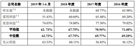 2016年-2018年,光云科技毛利率均为同行垫底。2016年-2018年及2019年1-6月,光云科技的综合毛利率分别为56.12%、56.85%、60.11%、63.53%,同行业可比公司平均值分别为71.40%、70.94%、67.75%、62.73%。