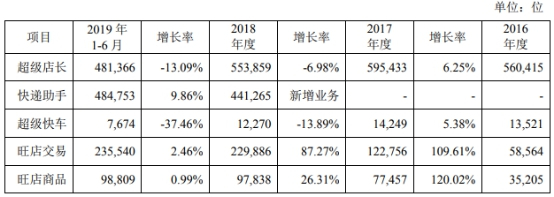 具体来看,超级店长产品用户数量在去年已经开始下滑,今年上半年继续下滑。2016年-2018年及2019年1-6月,光云科技超级店长付费用户数经折算后分别为56.04万位、59.54万位、55.39万位、48.14万位。2017年、2018年及2019年1-6月,光云科技主要产品超级店长用户数增长率分别为6.25%、-6.98%、-13.09%。
