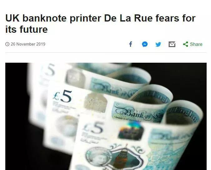 据今日俄罗斯电视台(RT )12月8日报道,为英国等140多个国家印制钞票的世界最大印钞厂—— 德拉鲁公司,日前发出了可能破产的警告,表示对其是否还有未来存在“巨大怀疑”。