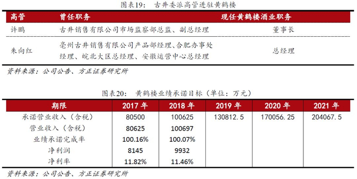 黄鹤楼协同效应加速显现。2016年,公司以自有资金81,600万元收购黄鹤楼酒业51%股权。黄鹤楼具有名酒基因,曾两次获评“中国名酒”称号,是湖北省唯一一个中国名酒。作为湖北省的代表,主打兼香型白酒,收购后可以与古井在香型和地理位置上形成互补协同,有助于丰富产品种类、优化产品结构、扩大市场销售规模,深度布局湖北市场。从经营情况来看,黄鹤楼18年收入8.7亿(不含税),净利9322万,基本完成预期目标,未来在“双名酒双百亿战略”指引下,收入规模有望持续扩大。同时,黄鹤楼的运作成功也为公司未来在并购发展模式上增强了信心,我们认为古井未来的成长潜力还很大。