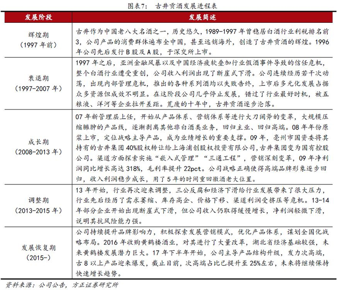 底蕴深厚,发展历经波折。古井贡酒位于安徽省亳州市古井镇,是我国浓香型白酒的典型代表,作为老八大名酒之一,公司历史悠久,发展历经波折——1989-1997年公司曾稳居白酒行业利税排名前三,后受亚洲金融风暴以及中国经济疲软影响叠加行业受到政策冲击、假酒事件打击消费者信心,公司业绩遭受重创;07年新管理层上任,着手产品体系、营销体系调整,开发年份原浆系列,开创“三通工程”为核心的深度营销模式,公司清晰战略使得高端品牌形象逐步回归,成功搭上了名酒复苏的最后一班车,五年后重回徽酒龙头地位;2017年开始,公司主导产品结构升级,发力次高端,古8以上产品迎来爆发,次高端的成功起势带动公司进入新一轮成长期。