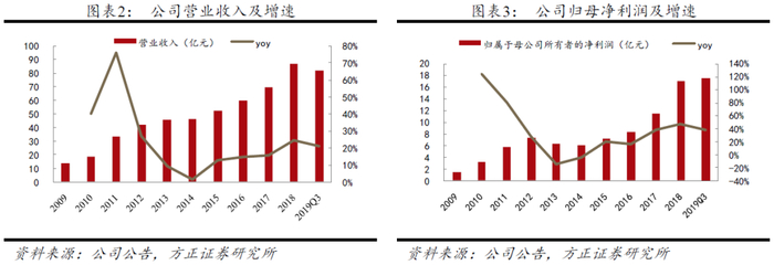2、凭借深度改革和营销优势,古井从复兴走向辉煌:古井贡酒在90年代发展高峰期,涉足多项产业的运作,导致企业发展一直徘徊不前。2007年新管理层上任后积极适应营销环境的变化,08年底推出主打中高端价格带的80-300元价位的年份原浆系列,通过自我调整和创新,管理和营销上探索出“嵌入式管理”“三盘互动”等等新的市场运作模式,构建“团购+烟酒店”为核心的竞争策略,从单一的资源竞争走向系统竞争。15年行业走出危机迎来复苏,公司收入利润率先企稳向好,2018年/2019前三季度公司分别实现营业收入86.86亿元/82.03亿元,同比+24.65%/+21.31%;归属于母公司净利润16.95亿元/17.42亿元,同比+47.57%/+38.69%,业绩连续多个季度保持加速态势,次高端占比逐步提升,新的成长趋势已来。