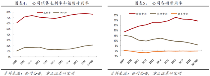 市场深耕进入收获期,费用率趋势下行,净利率持续提升:2008年近10年以来,公司始终保持高投放费用投放,高举高打,销售费用率呈现出逐年递增的趋势,2017年开始,公司深耕市场成果开始显现,销售费用率首次出现同比下降的情况(同比减1.8pct至31.1%),2019Q3进一步下降7.3pct至25.8%,净利连续保持高增态势,一方面,次高端价位爆发带来的明显趋势就是利润增速大于收入增速,公司200元以上价位产品发力,产品结构持续提升;另一方面,多年深耕后规模效应开始显现,同时管理层开始主动控制费用,之前区域自主费用投放开始收回总部,提升经营效率。随着未来公司市场逐步走向稳固,经营效率进一步提升,我们判断公司费用率有望继续保持下降趋势,利润释放空间巨大。